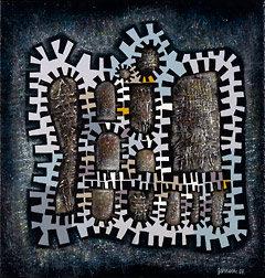 Image: George Johnson, Canto, 1965, oil and mixed media on board. La Trobe University, FM Courtis Collection, LTUC050. © Estate of George Johnson
