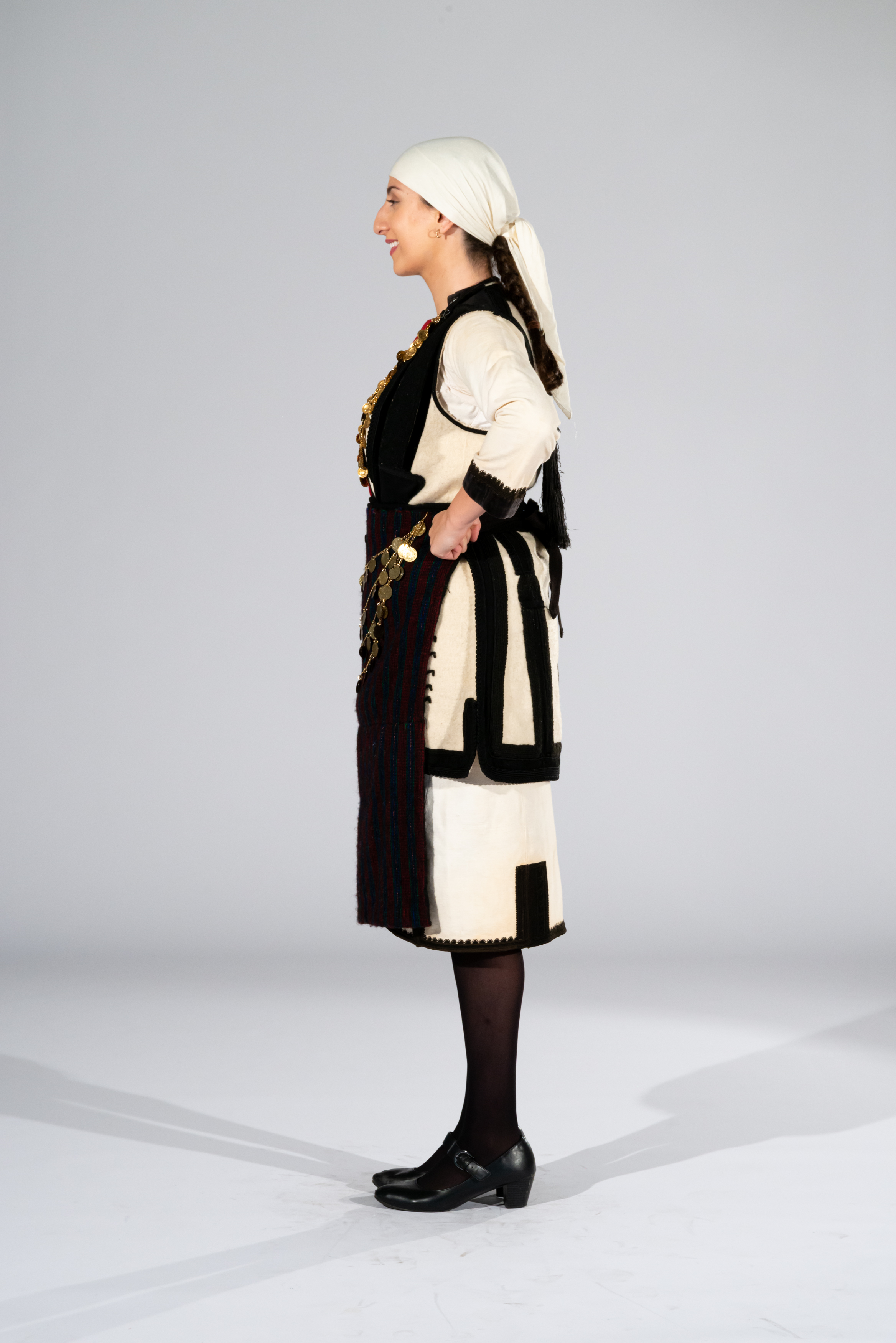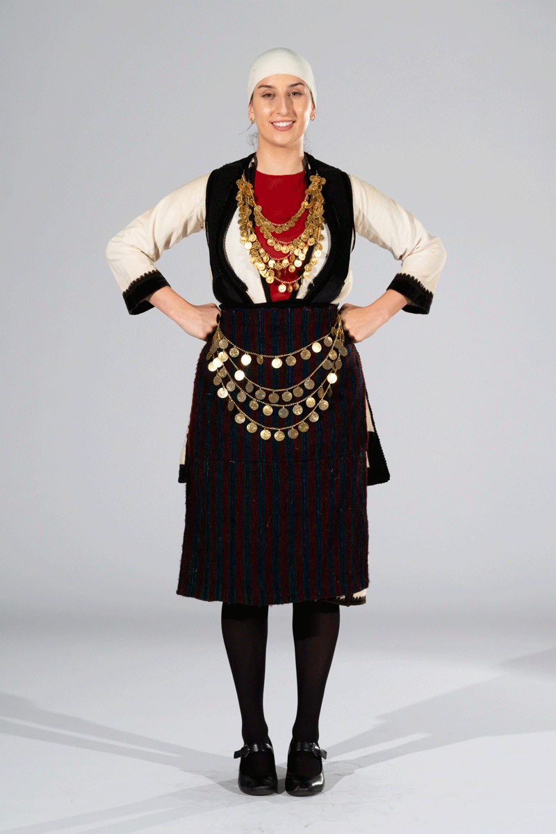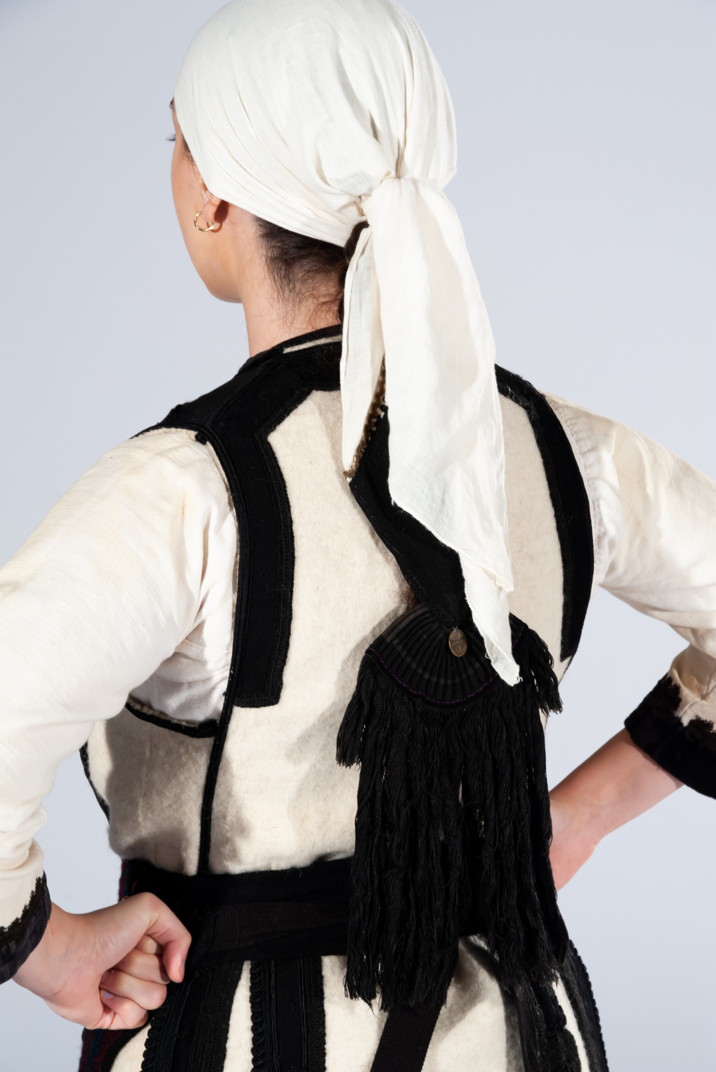 Sagiás or Sagiáki: an open, sleeveless vest made out of thick fabric, traditionally woven on the loom. The vest was decorated with embroider stitching. The depicted costume has matching embroidery with the dress worn underneath, however, this was not always the case. In Florinian custom tradition, this part of the costume would be given to a woman by her mother-in-law.