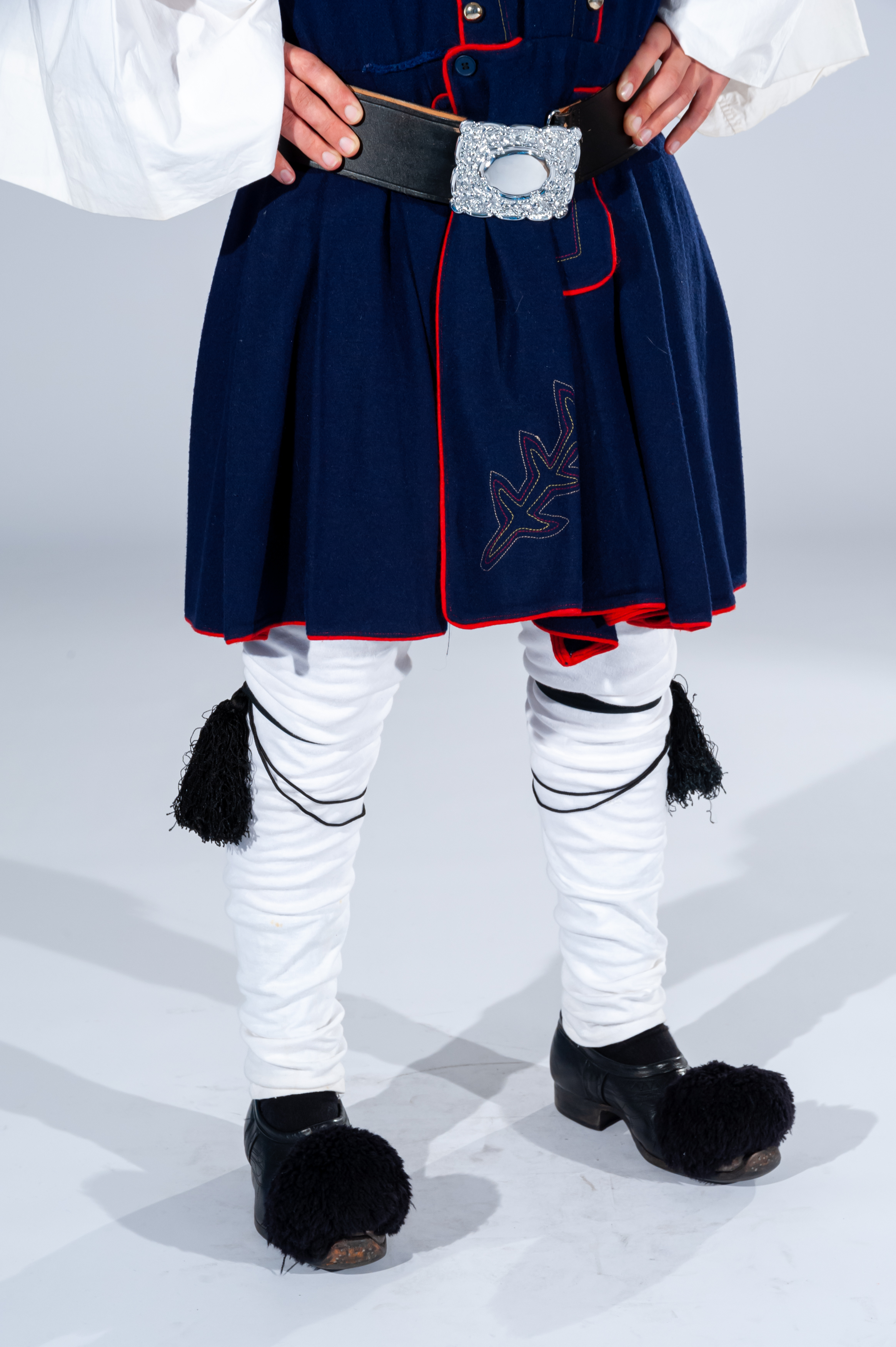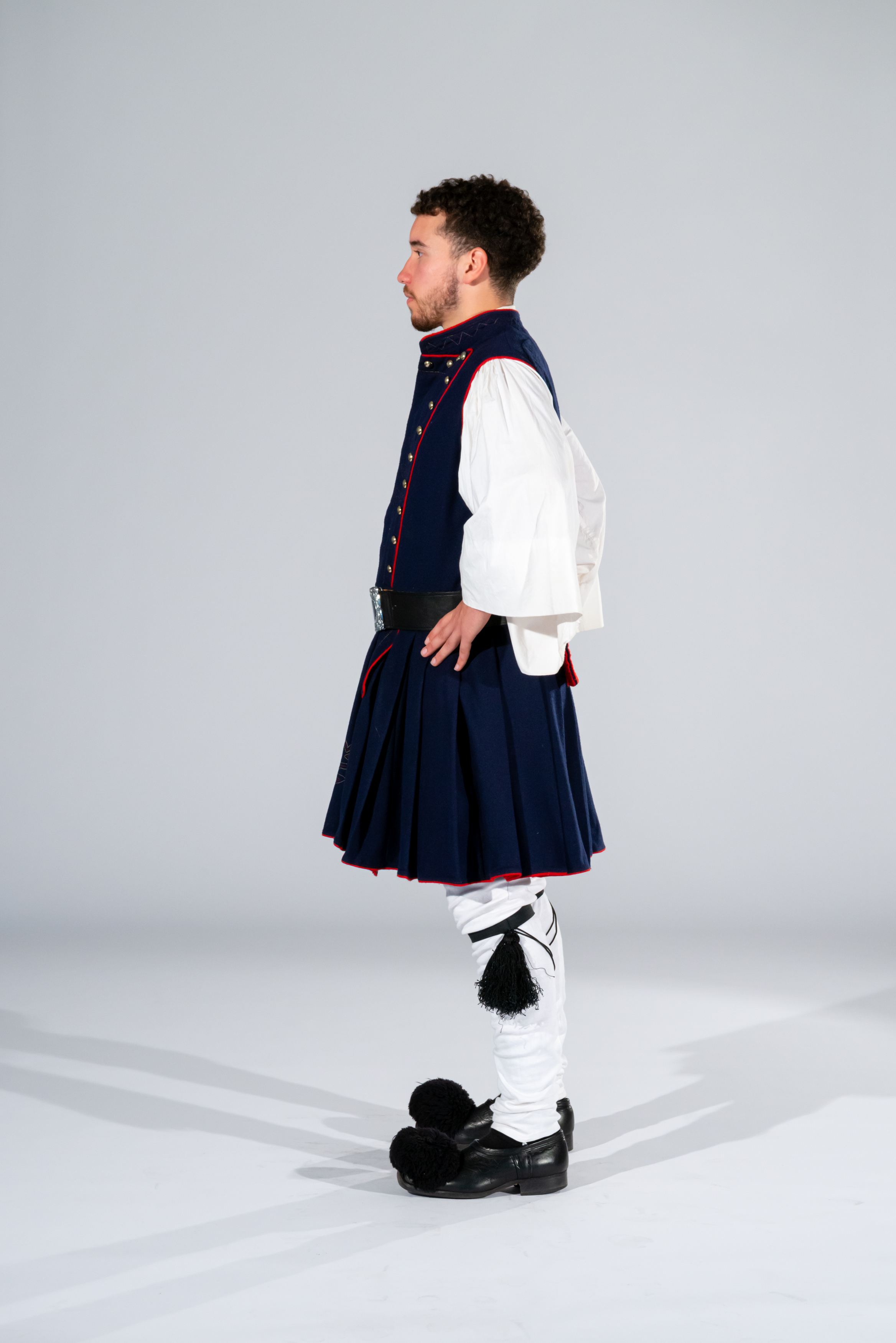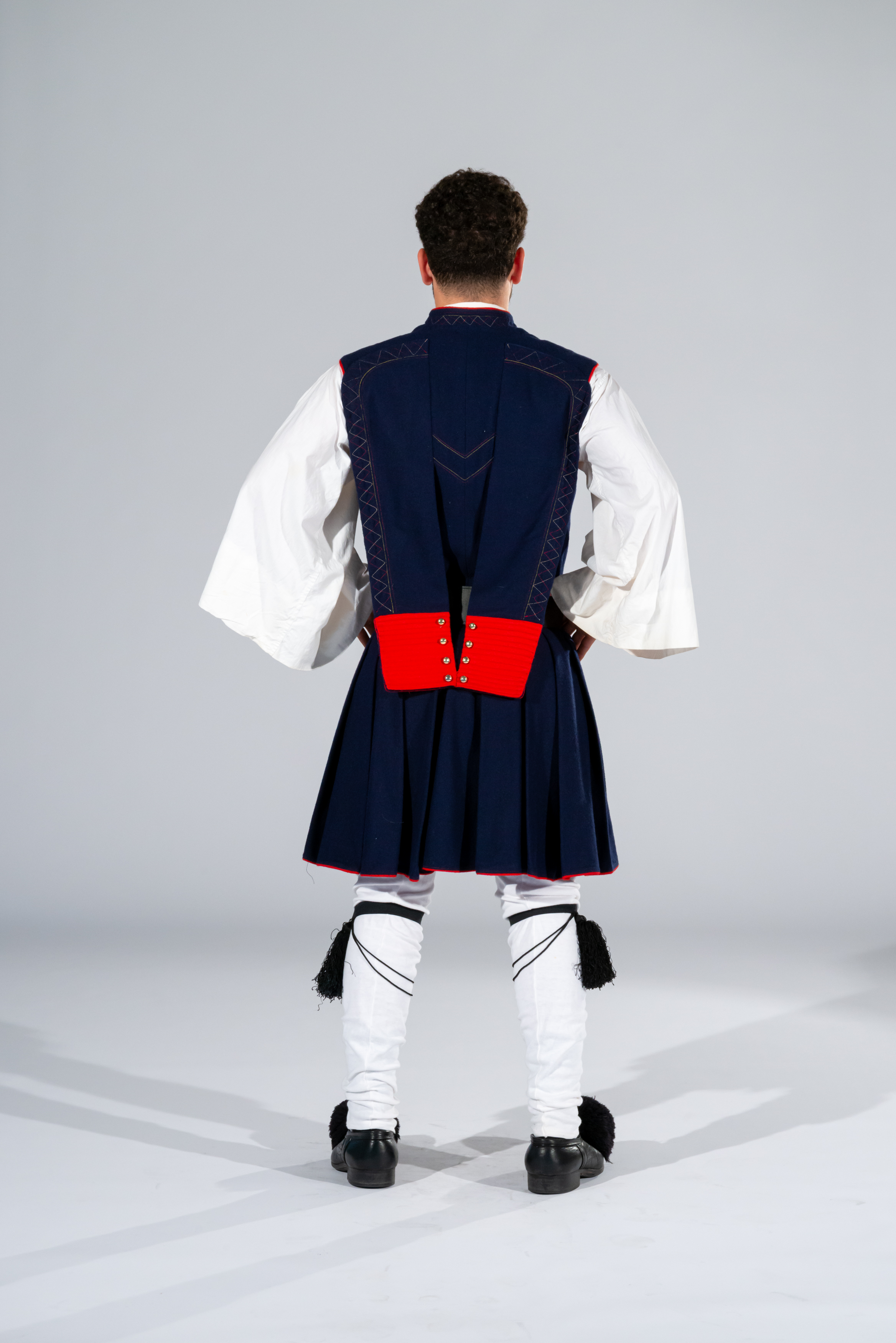 Ntoulamás: a dress that combines a Férmeli (vest) and a foustanéla (skirt with pleats). The “ntoulamás” is worn over the shirt and is blue, with red thread stitching and silver spikes.