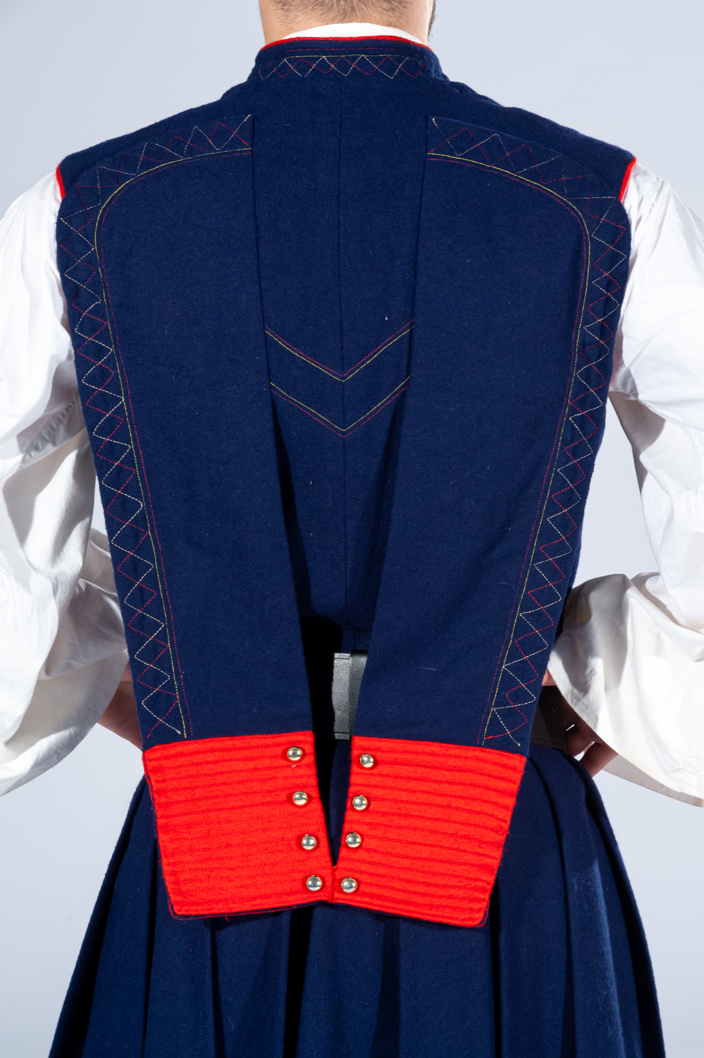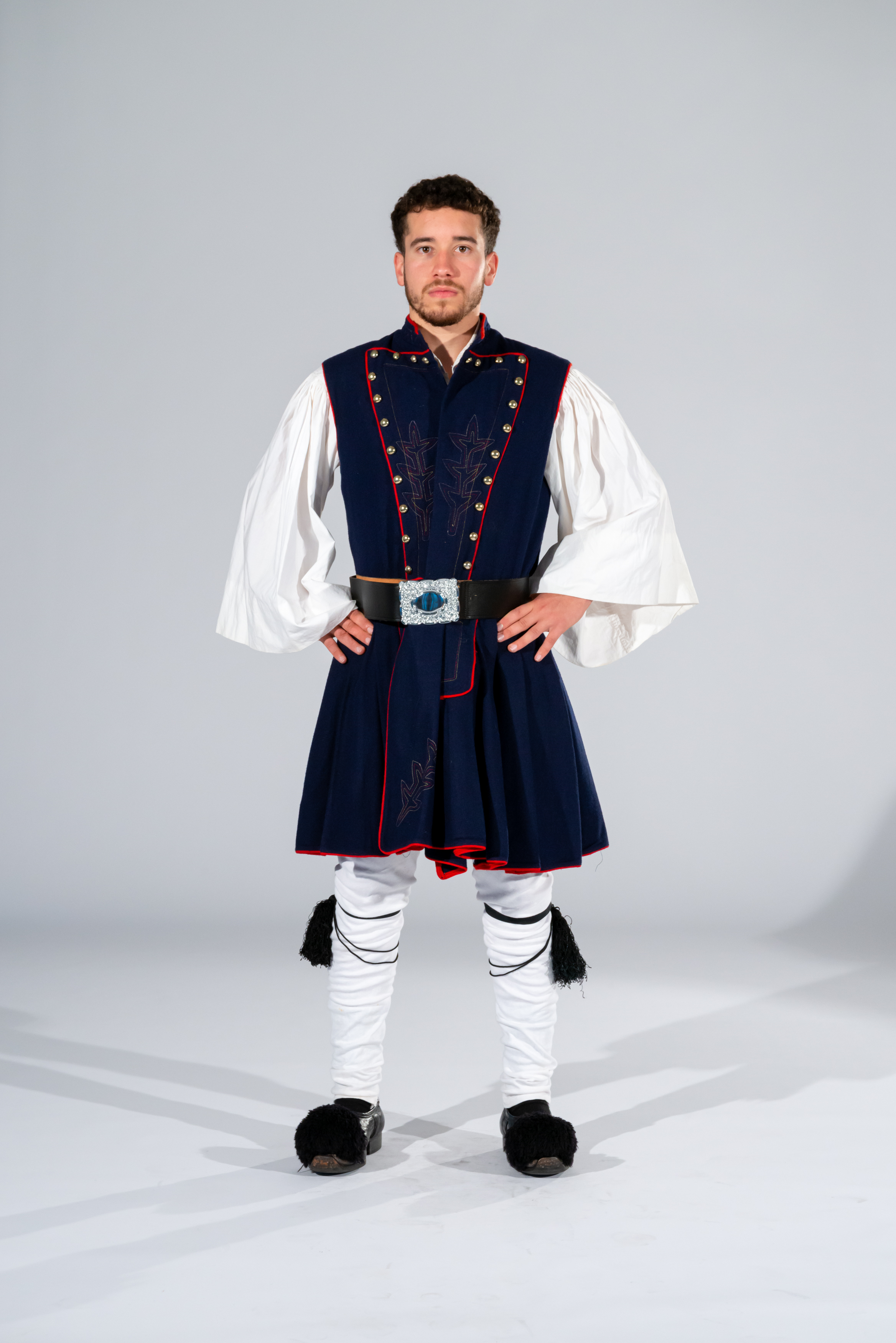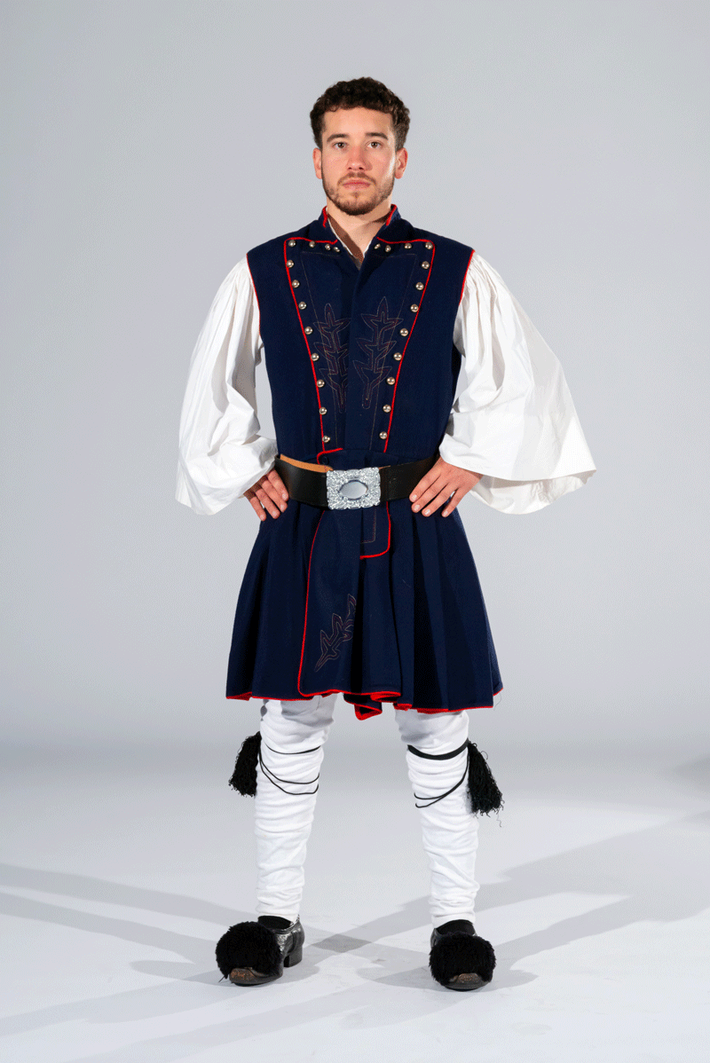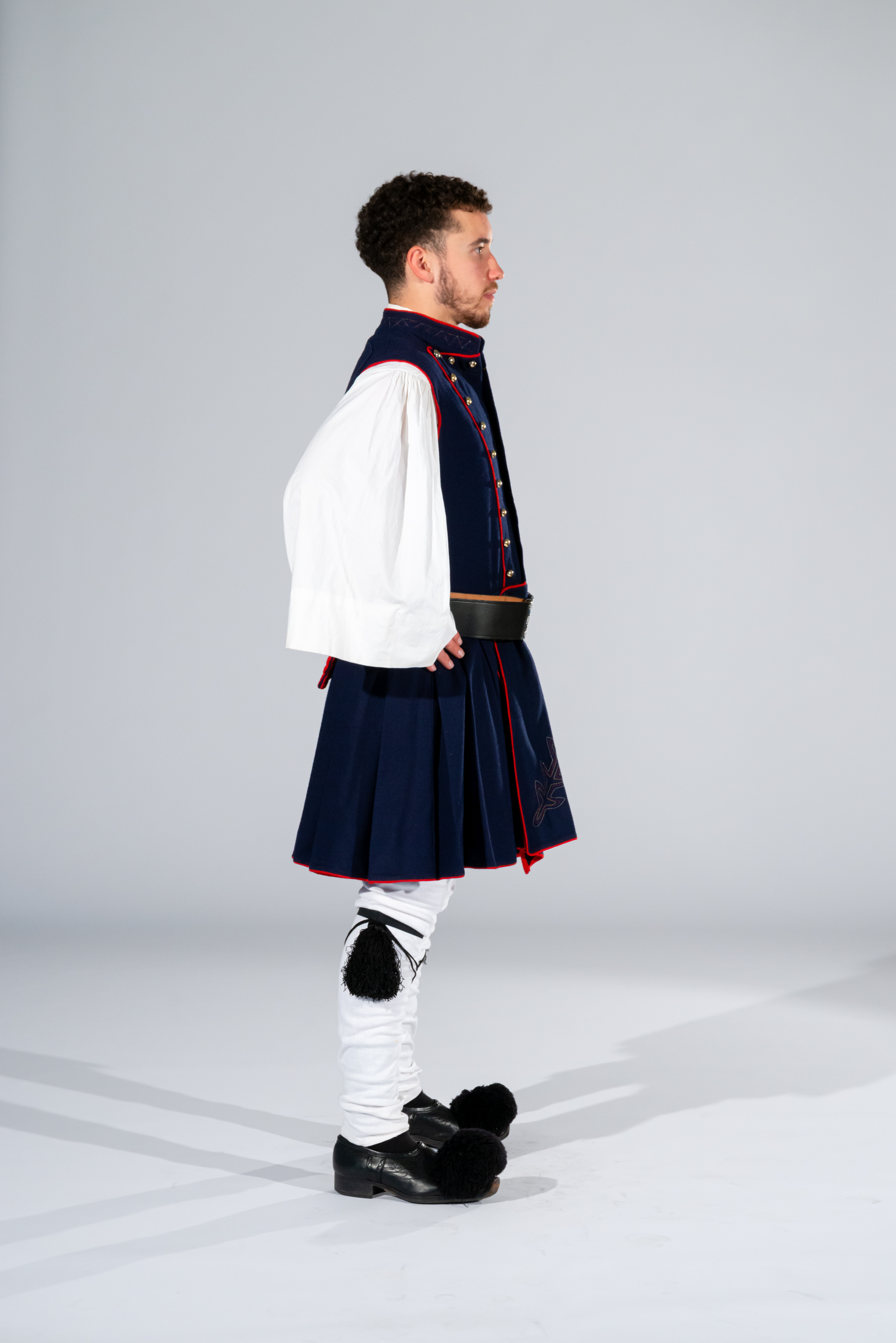 Ntoulamás: a dress that combines a Férmeli (vest) and a foustanéla (skirt with pleats). The “ntoulamás” is worn over the shirt and is blue, with red thread stitching and silver spikes.