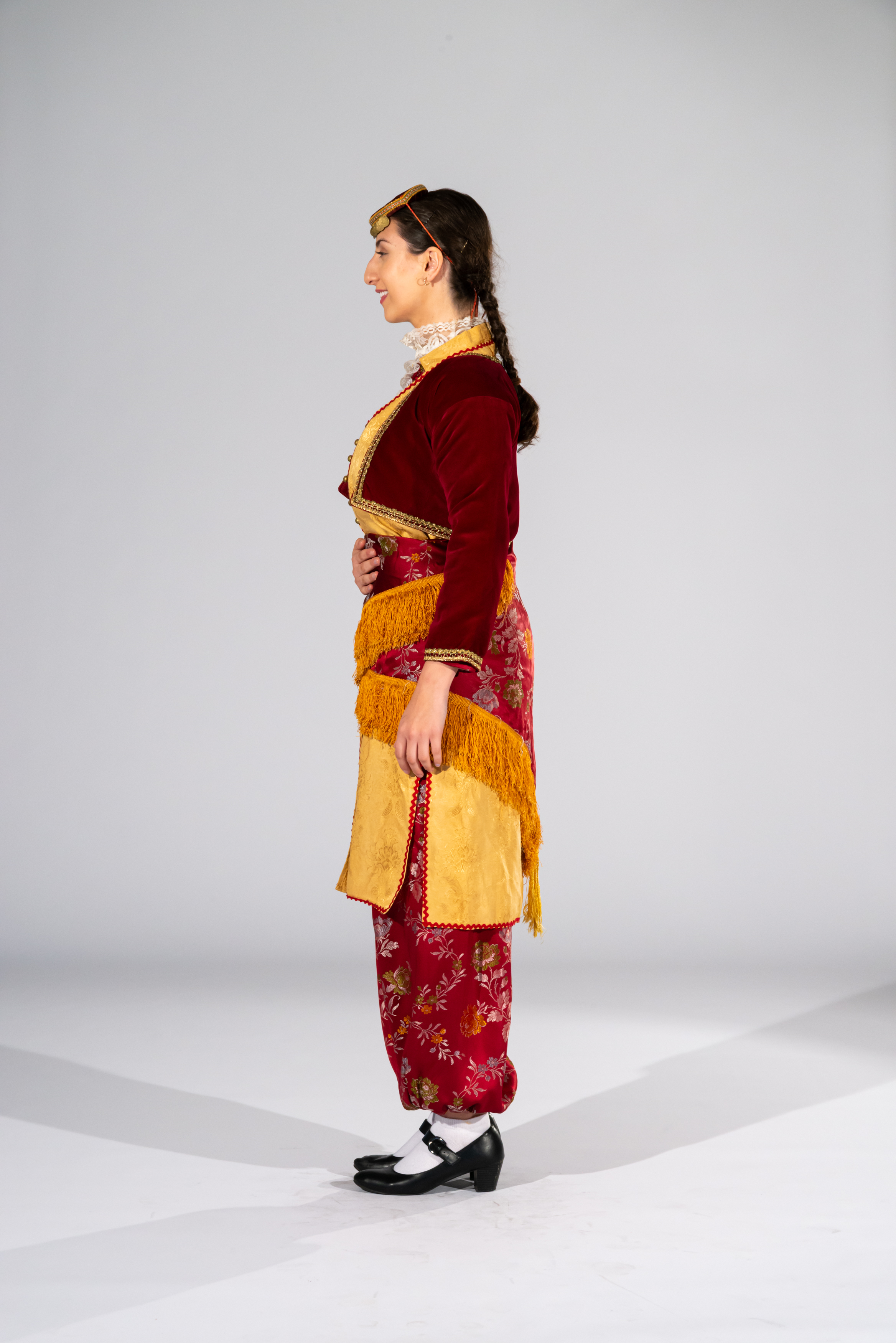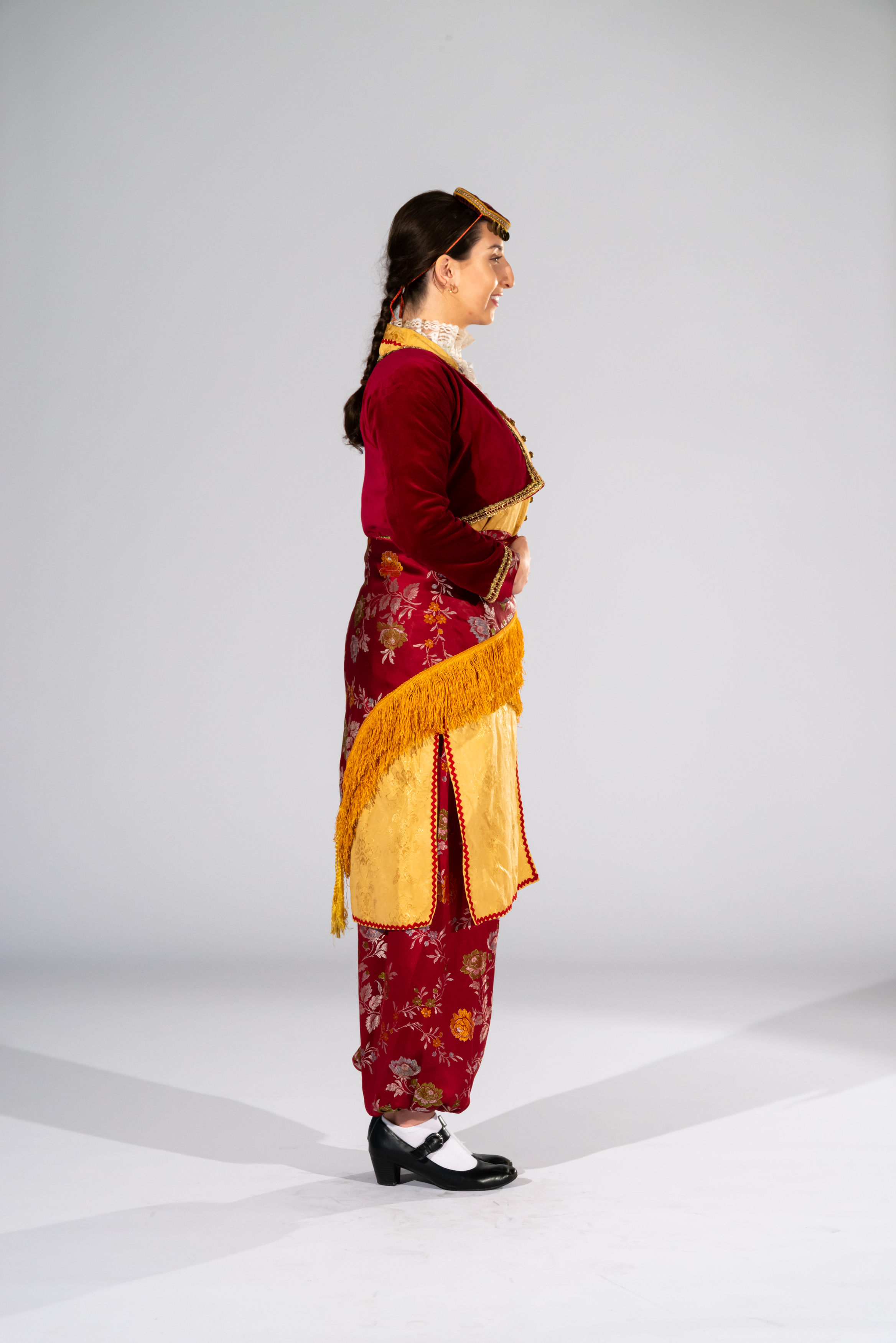 Katifé: a velvet vest worn on top of the zipúna. The vest is quite short and form-fitting. Its length ranges from the shoulder to just above the waist. It usually comes in a range of colours but the most common is red, maroon and plum. Katifé is embroidered with gold stitching at the neck, waist, chest and sleeves.