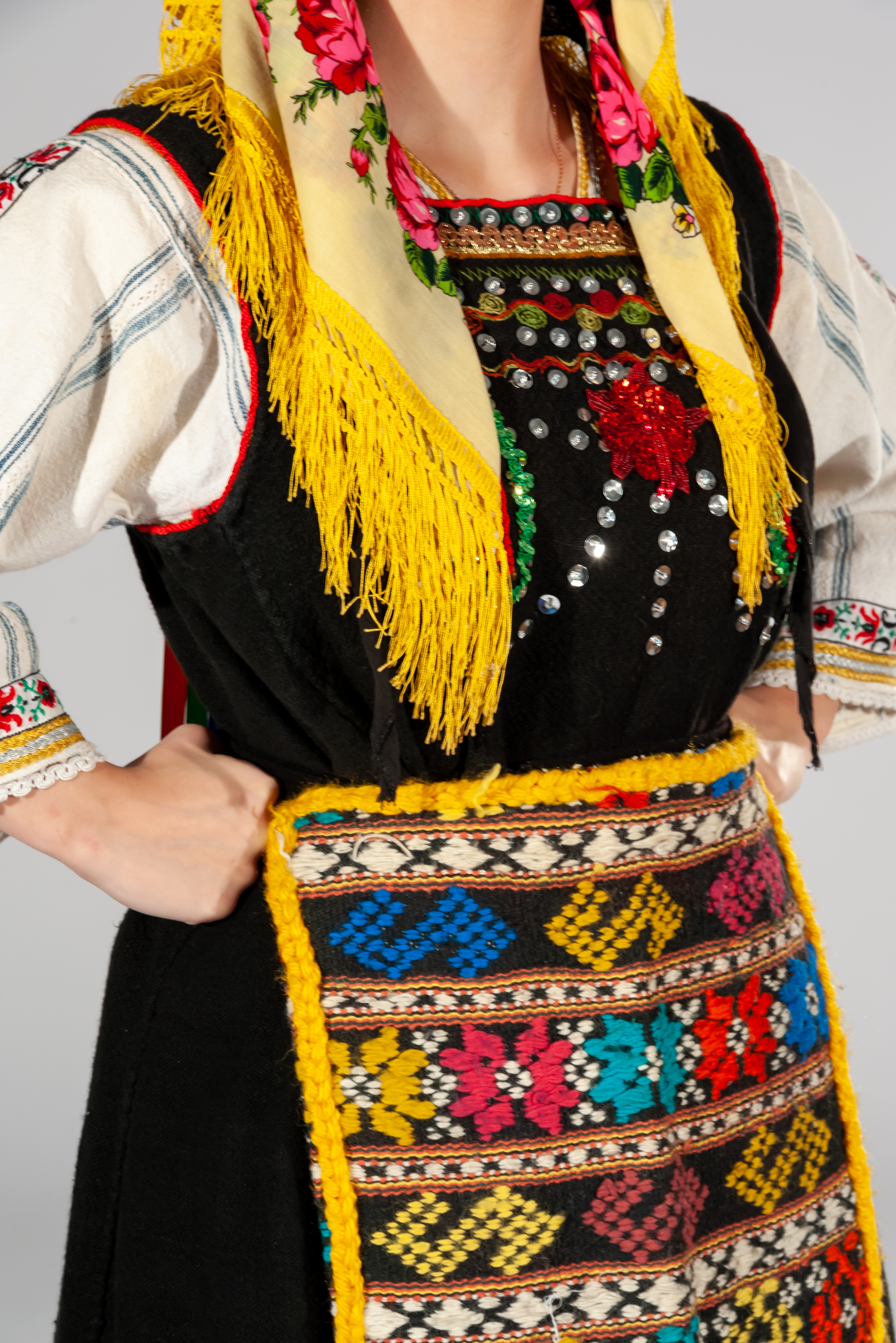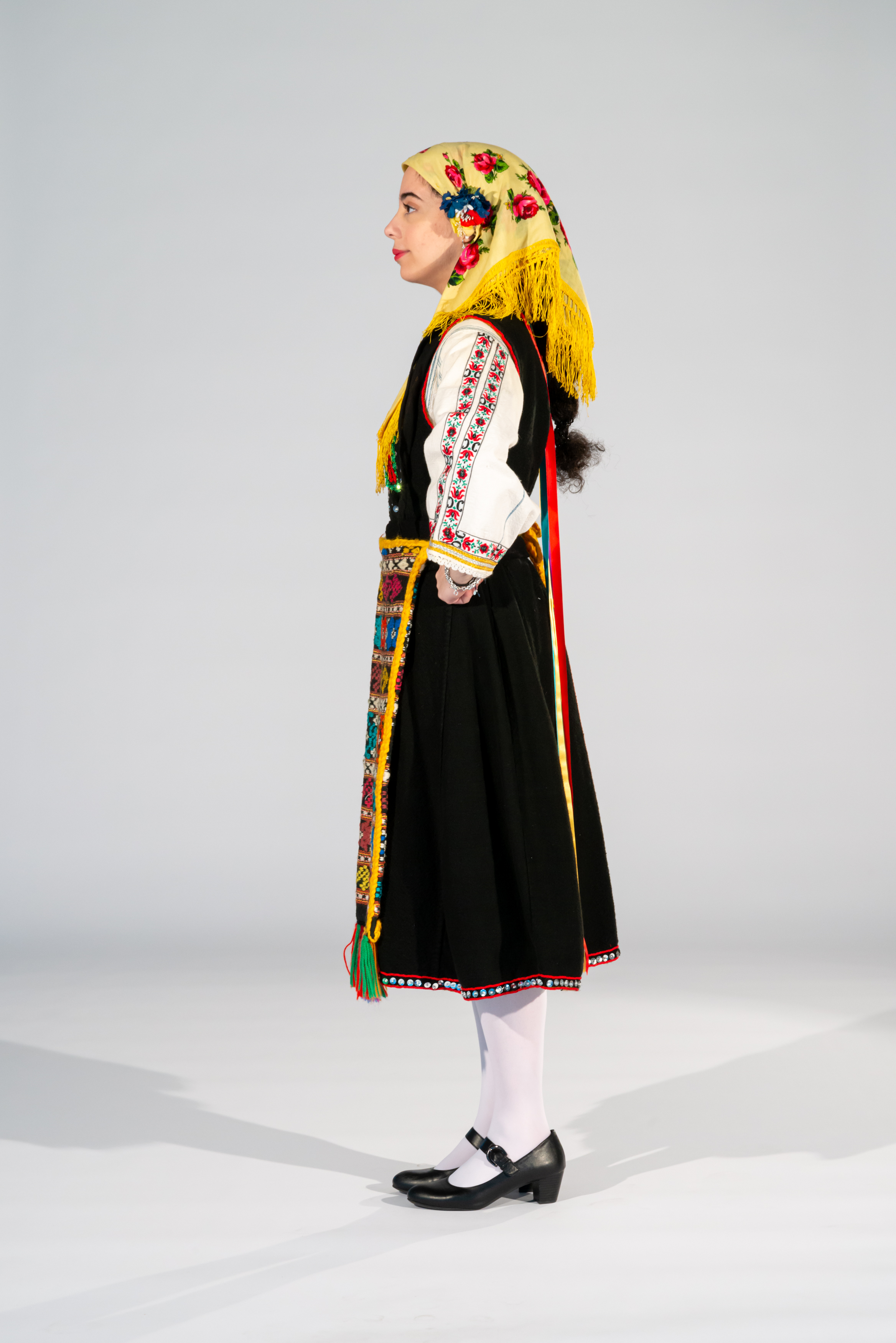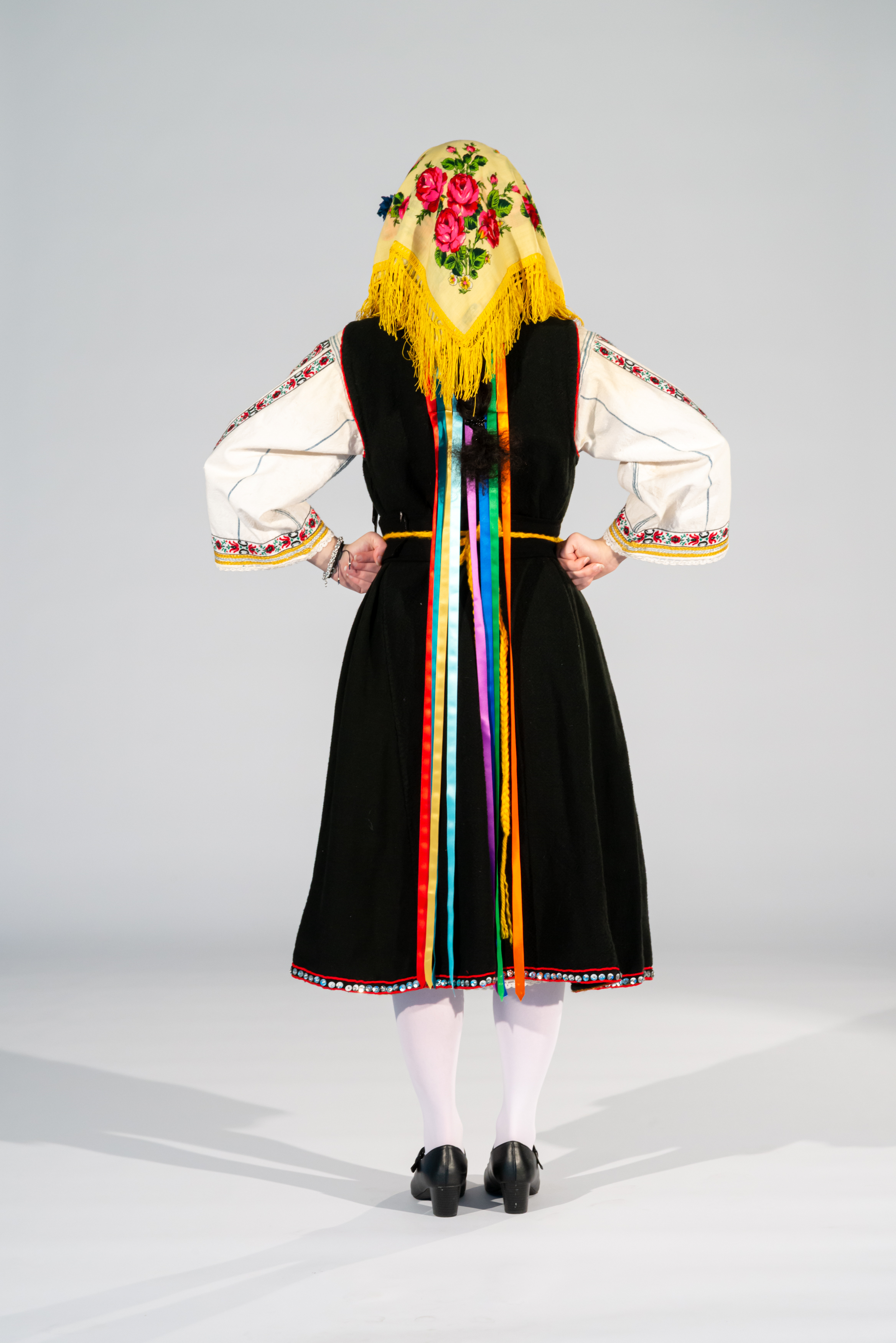 Tsoúkna: a thick fabric dress in black, embroidered with sequins and colourful cotton and silk threads. The dress displays five colourful silk ribbons hanging from the back which reflected marital status, meaning this design was only for single or newly married women. At the front there are two openings in the chest area called korfoulíthres that would traditionally assist women with breastfeeding.