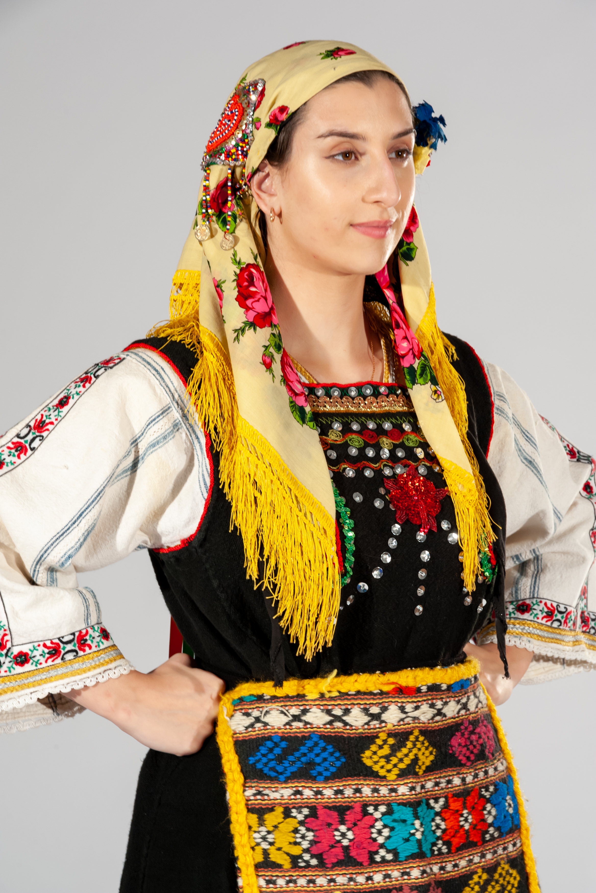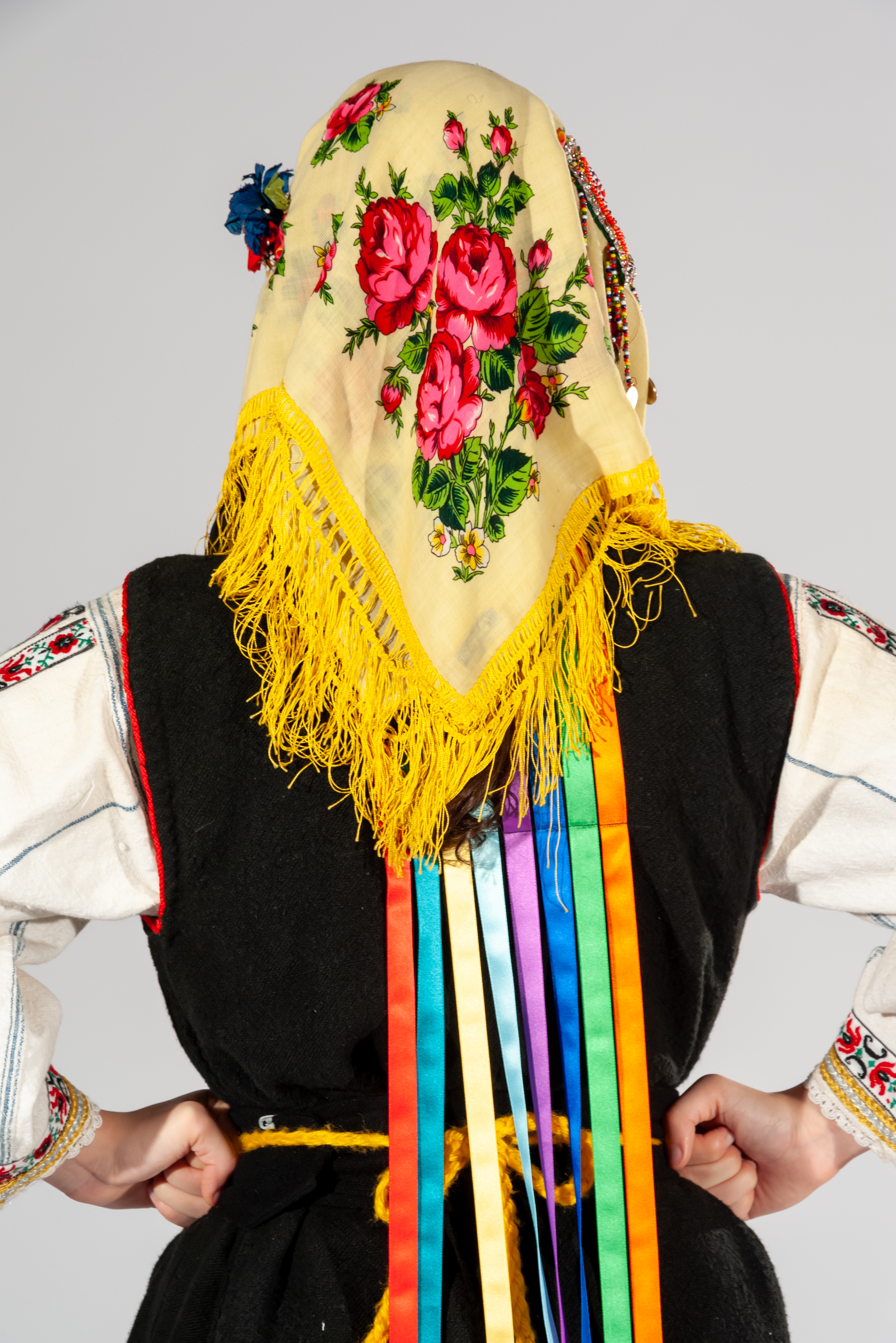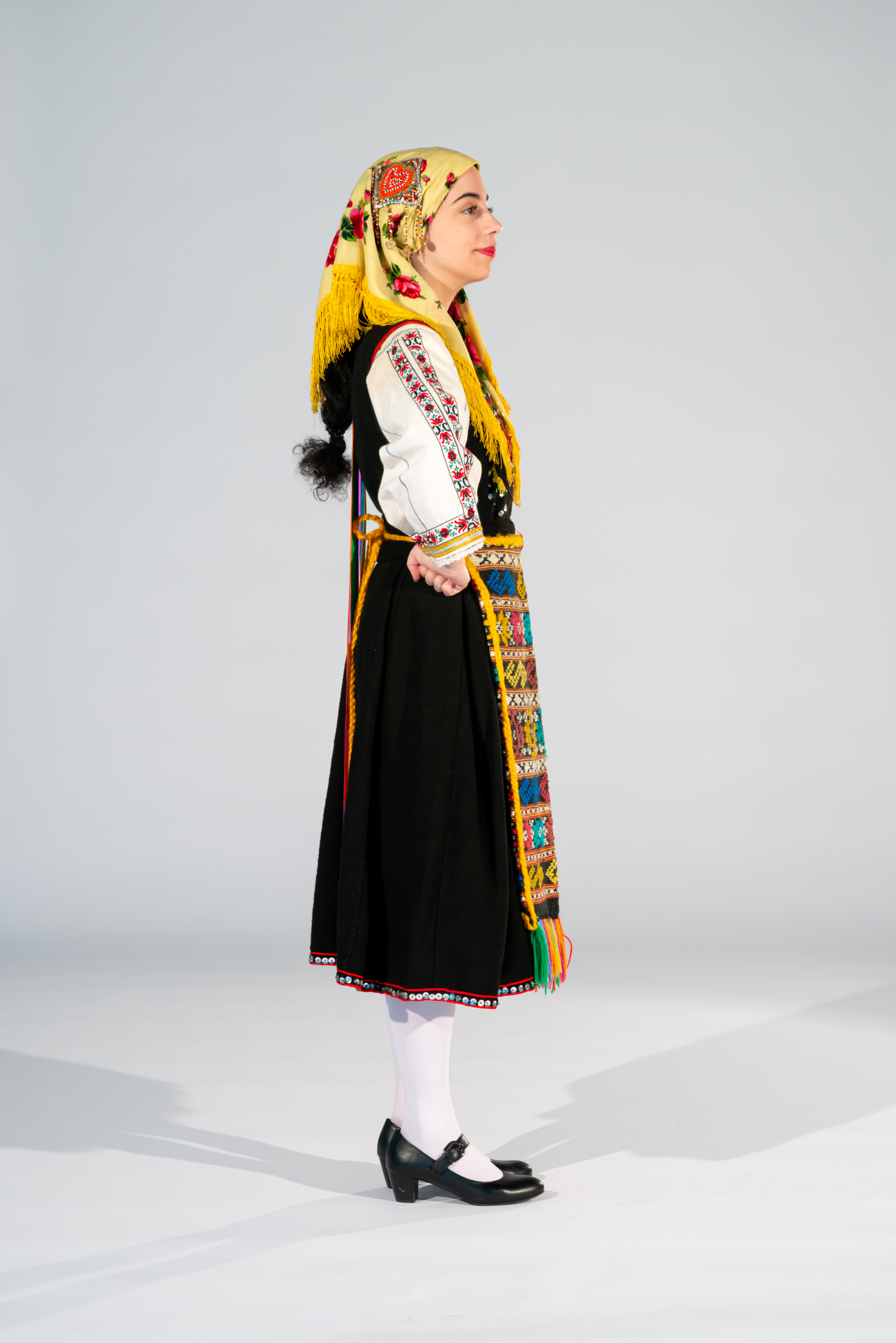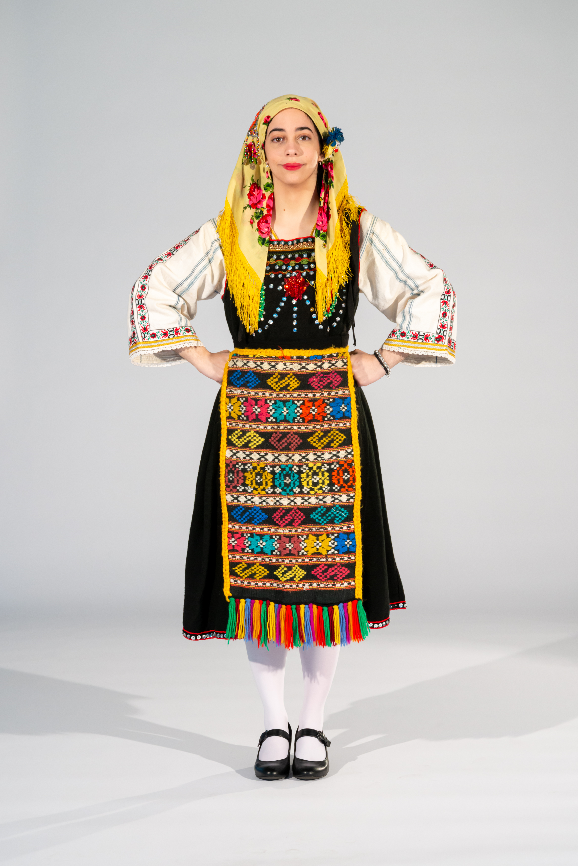 Tsoúkna: a thick fabric dress in black, embroidered with sequins and colourful cotton and silk threads. The dress displays five colourful silk ribbons hanging from the back which reflected marital status, meaning this design was only for single or newly married women. At the front there are two openings in the chest area called korfoulíthres that would traditionally assist women with breastfeeding.
