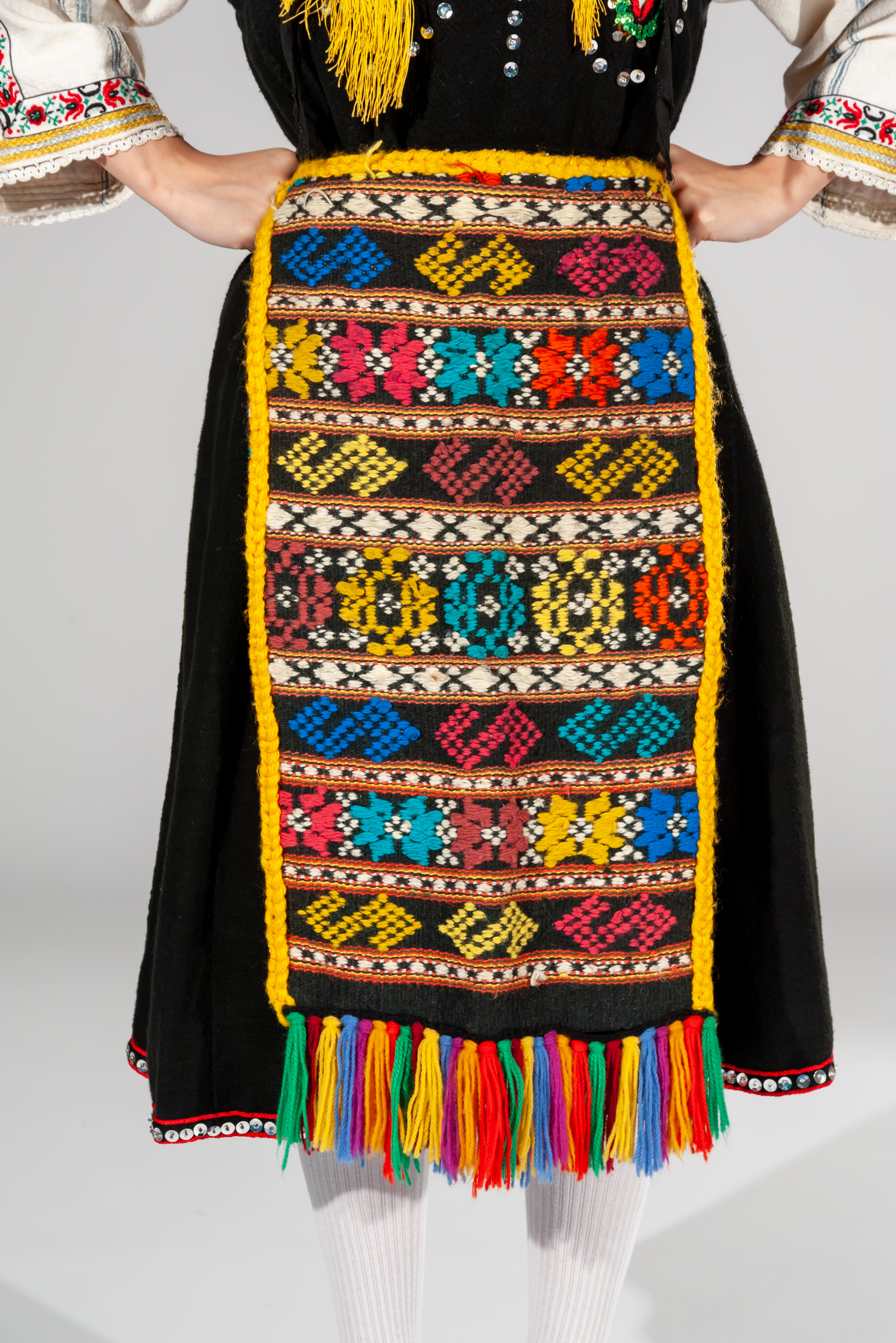 Zaprátsa: a woolen apron of a multitude of colours and patterns. The aprons were traditionally woven on the loom.