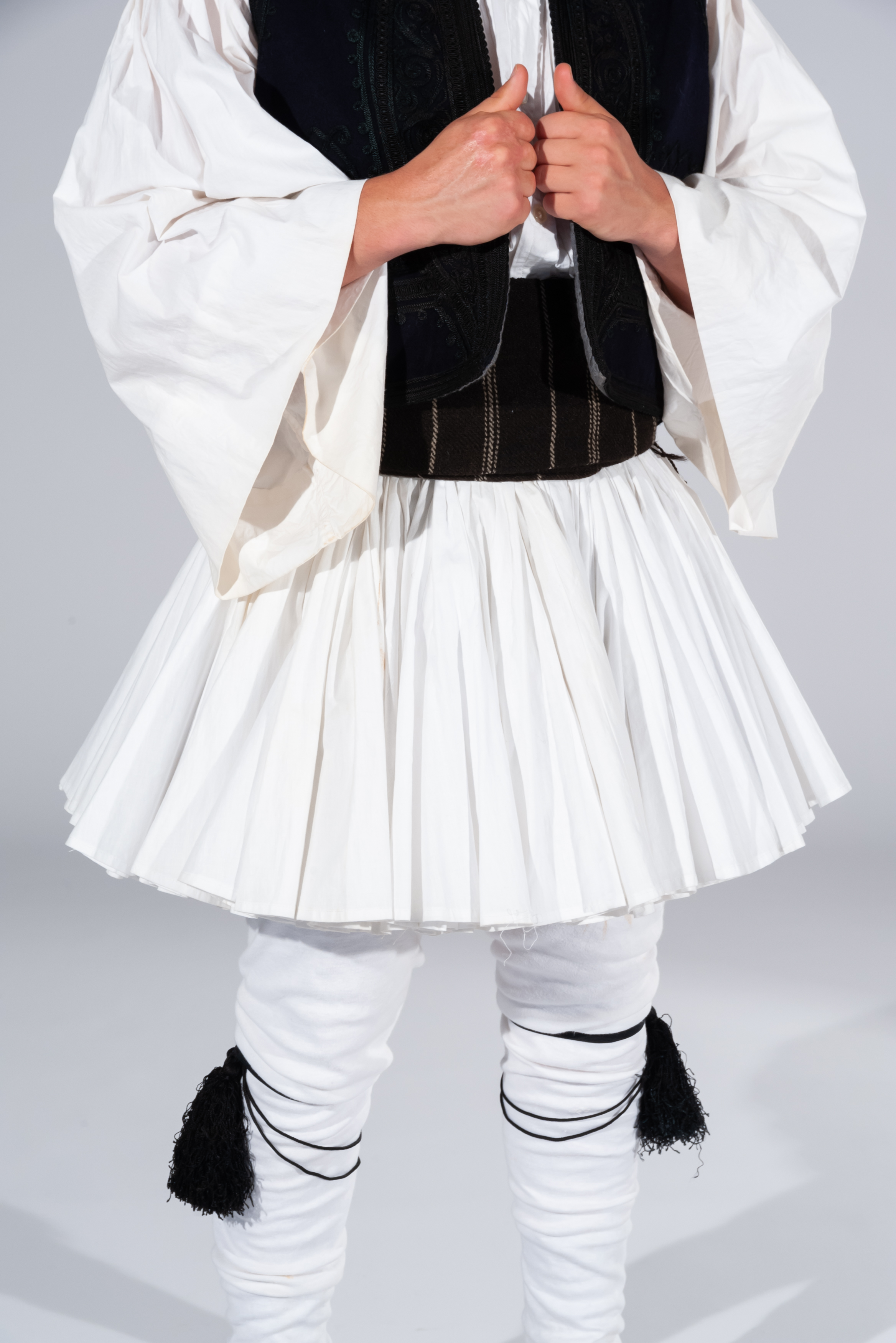 Foustanéla: a white skirt that folds over 400 times, worn by men. The 400 folds represent the 400 years of occupation under the Ottomans and the colour represents the purity of the struggle for freedom. The making of a “foustanéla” requires roughly 30 metres of fabric.