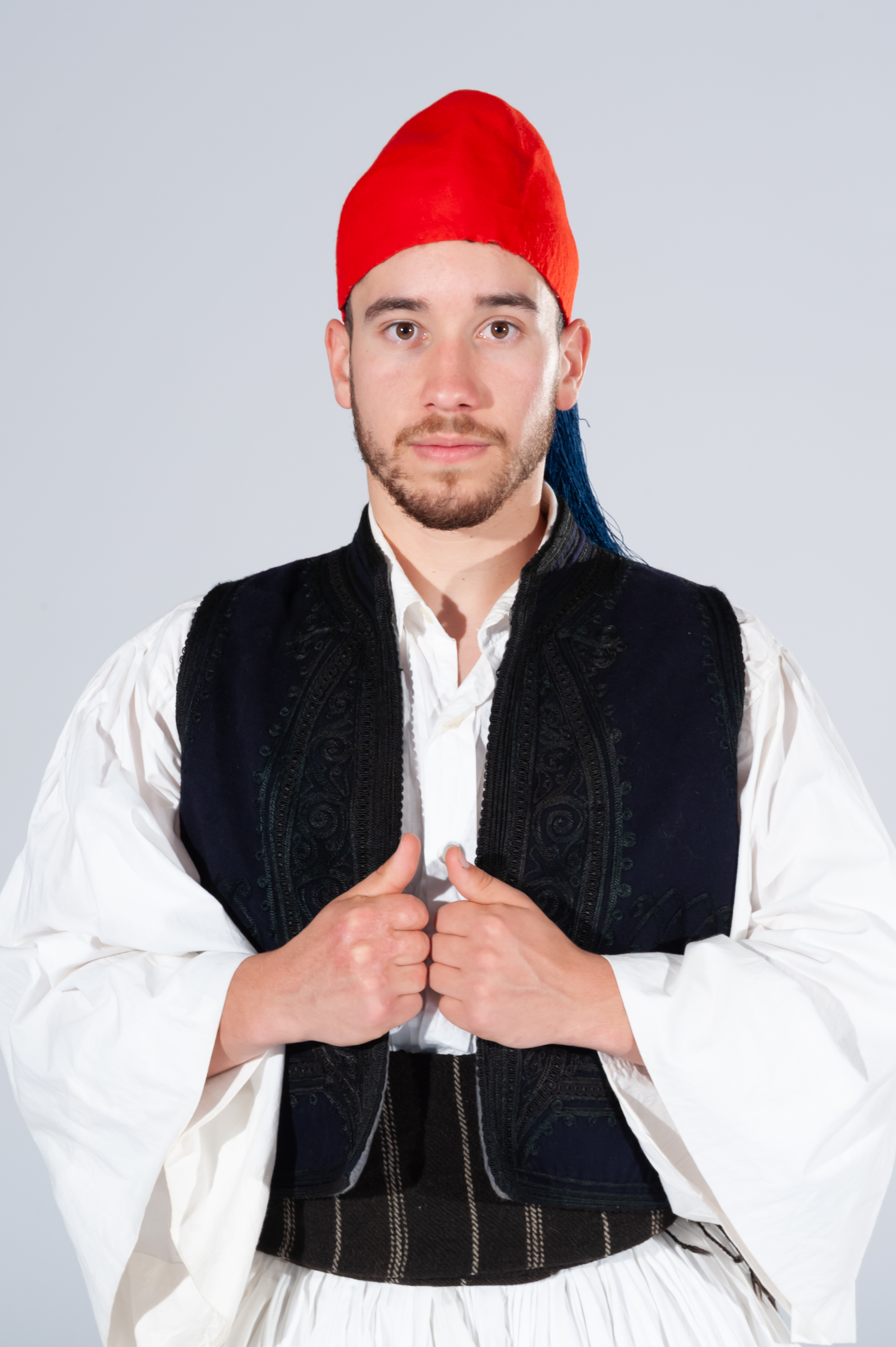 Férmeli: a vest, of blue, red or black, worn over the shirt. The embroided stitching of the vest depicts folkloric patterns and like the fabric, the thread could be different colours such as black or gold.