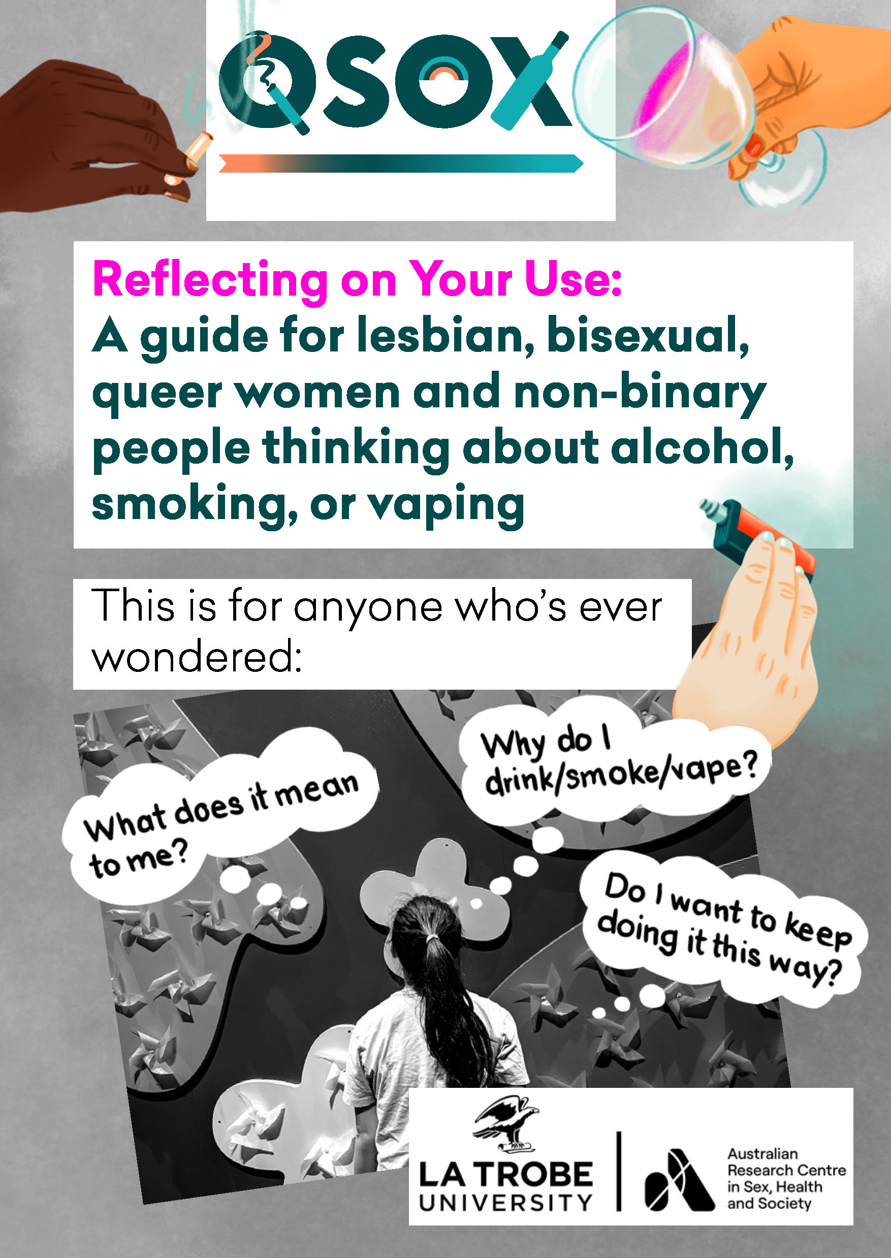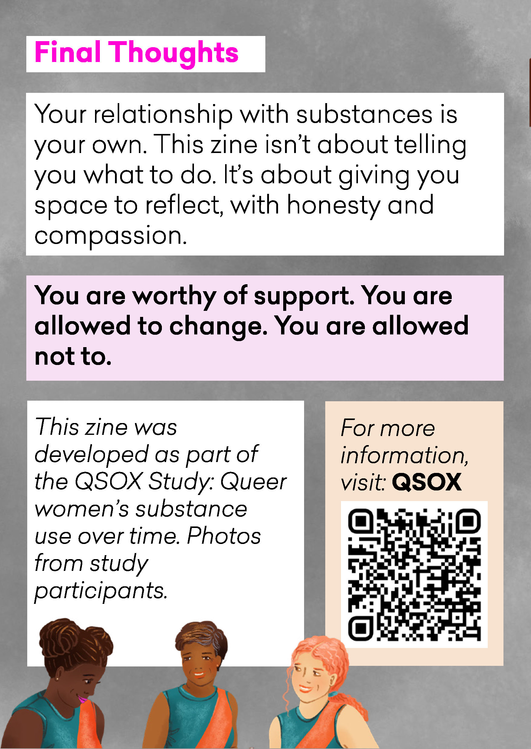 ![QSOX zine page 8 Text ‘Final thoughts: Your relationship with substances is your own. This zine isn’t about telling you what to do. It’s about giving you space to reflect, with honesty and compassion. You are worthy of support. You are allowed to change. You are allowed not to. This zine was developed as part of the QSOX Study: Queer women’s substance use over time. Photos from study participants. For more information, visit QSOX [QR code].' with a drawing of three diverse women wearing AFL jerseys.](https://latr-dev.matrix.squiz.cloud/arcshs/images/QSOX-zine-page-8.jpeg)