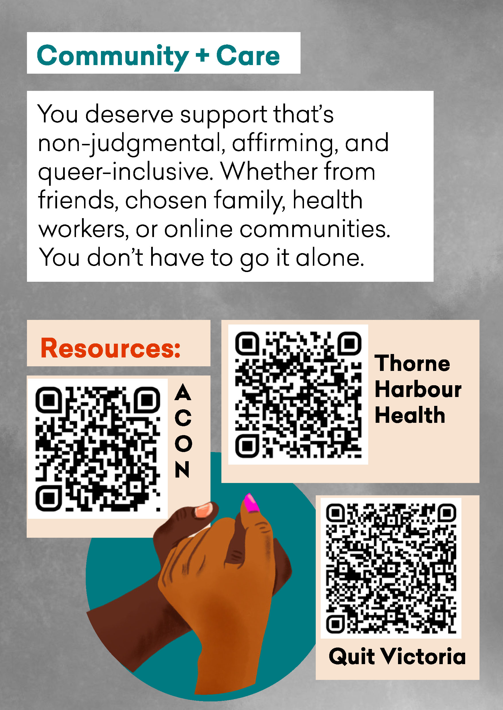 ![QSOX zine page 7 Text ‘Community + care: You deserve support that’s non-judgmental, affirming and queer-inclusive. Whether from friends, chosen family, health workers or online communities. You don’t have to go it alone. Resources: ACON [QR code] Thorne Harbour Health [QR code] Quit Victoria [QR code]' with a drawing of two women’s hands clasping each other.](https://latr-dev.matrix.squiz.cloud/arcshs/images/QSOX-zine-page-7.jpeg)