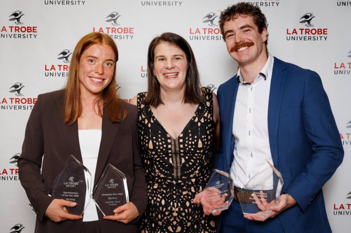 Main Image: 2025 Blues Sport Awards Sportspeople of the Year Award winners Mia King (left) and Ben Cosgriff (right) with event MC and La Trobe University Journalism Alumna, Lauren Bordin (centre).