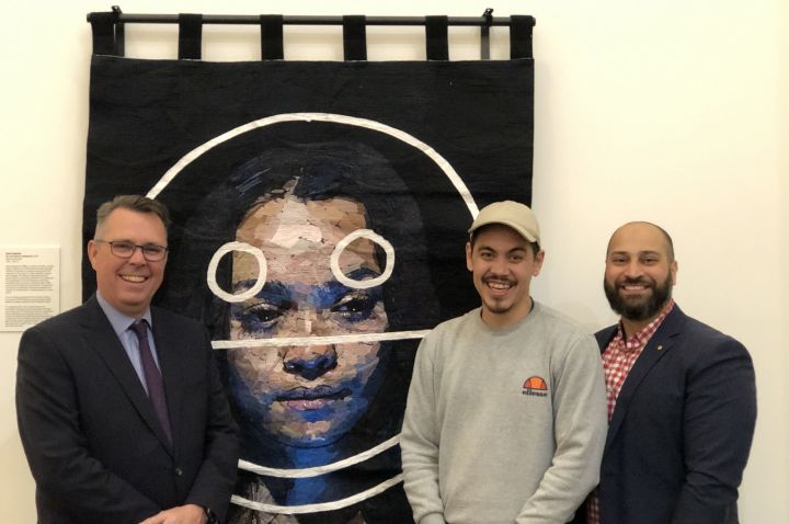 PHOTO: Winning artist Abdul Abdullah with Professor John Dewar, Vice-Chancellor La Trobe University and Islamic Museum of Australia Chair Moustafa Fahour.