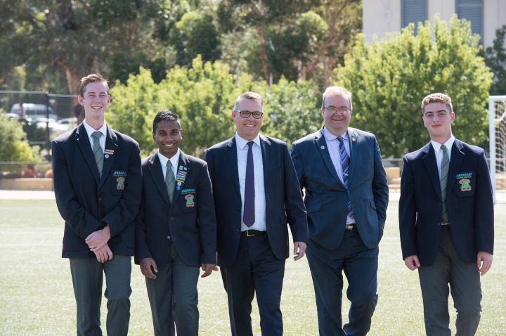 PHOTO - left to right: William Conlon (Parade Vice Captain), Pinidu Chandrasekera (Parade Vice Captain), La Trobe Vice-Chancellor Professor John Dewar, Parade College Principal Andrew Kuppe, Max Tricarico (Parade School Captain)