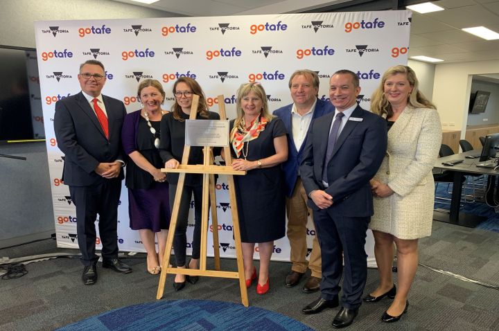 L-R: Vice Chancellor Progressor John Dewar AO, Member for Yan Yean Danielle Green, Minister for Regional Development Jaclyn Symes, Minister for Training and Skills and Higher Education Gayle Tierney, Member for McEwen Rob Mitchell, GOTAFE CEO Travis Heeney and GOTAFE Board Chair Diana Taylor.